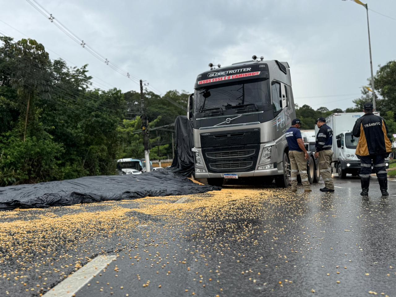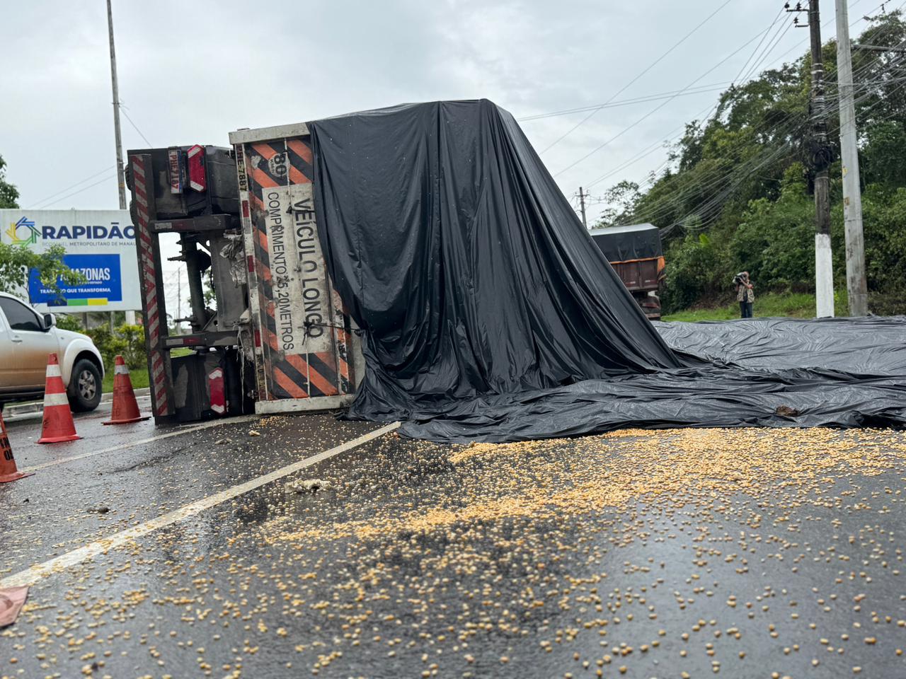 Uma carreta que transportava uma carga de milho tombou na Avenida do Turismo, em Manaus, na manhã desta terça-feira (23), provocando um congestionamento intenso e trânsito lento no local. O acidente deixou parte da via parcialmente interditada, permitindo a passagem de veículos por apenas uma faixa.