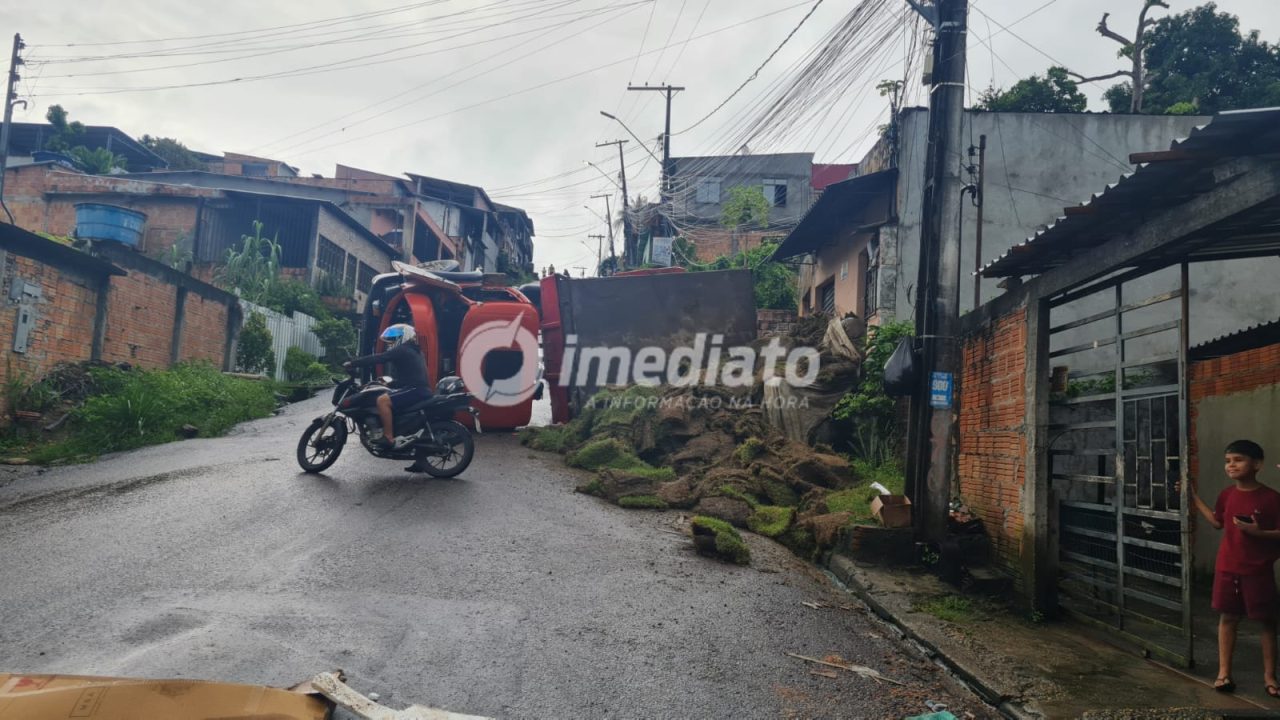 Caçamba tomba em ladeira em Manaus e deixa trânsito complicado na região.