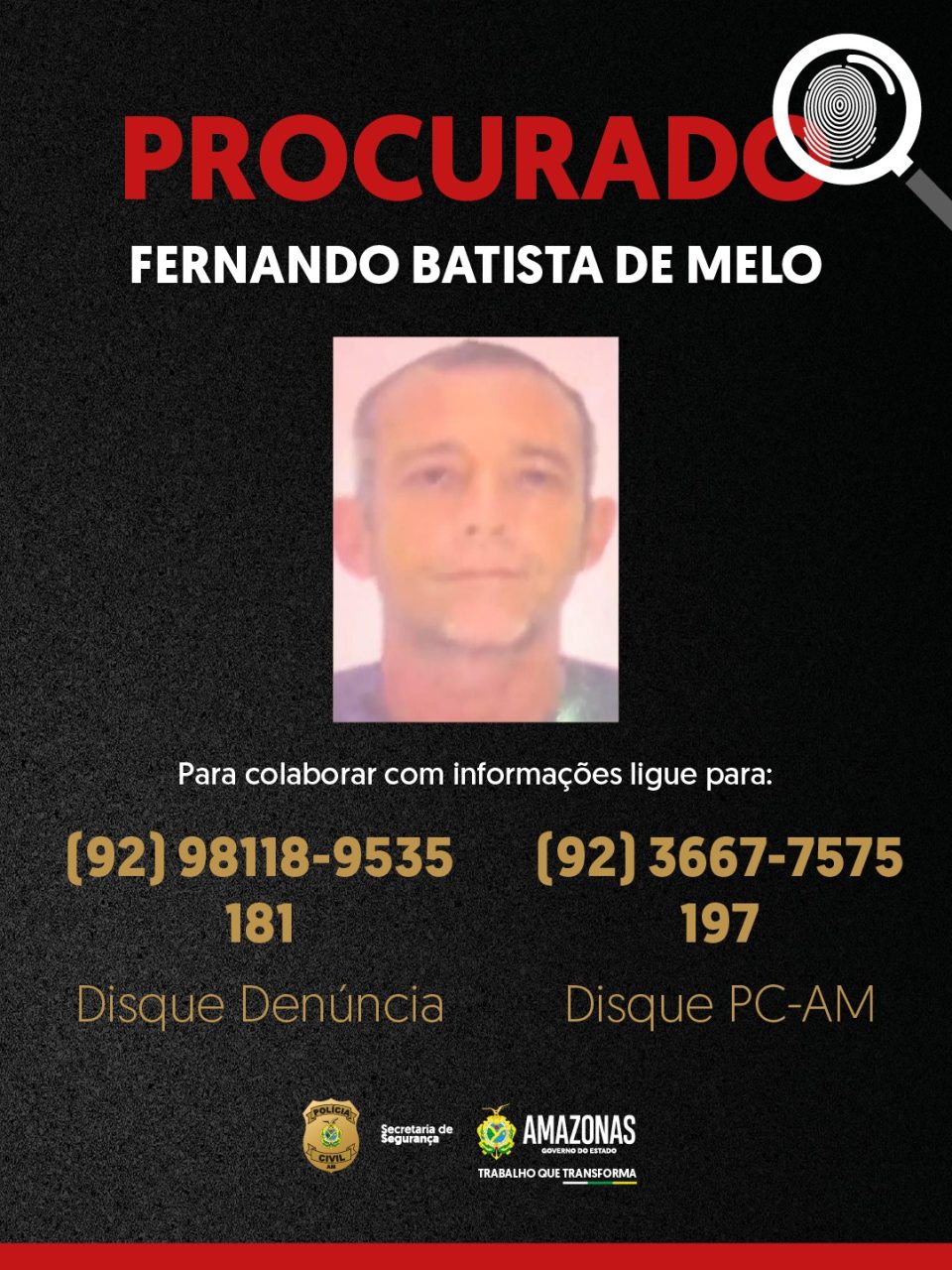 A Polícia Civil pede a colaboração da população. Informações que possam levar à localização de Fernando Melo podem ser repassadas de forma anônima aos canais oficiais de segurança.
