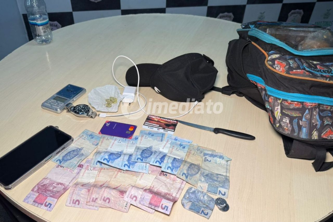 Na revista pessoal, foram apreendidos uma porção de droga, uma faca, classificada como arma branca, uma balança de precisão e cerca de R$ 49 em dinheiro, valor que, segundo a guarnição, seria proveniente da comercialização de entorpecentes.