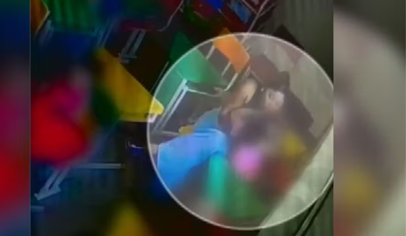 No vídeo, a mulher aparece sentada ao lado da aluna. Em seguida, a menina parece fazer uma pergunta, quando a monitora reage de forma agressiva, segurando a criança com força pelo pescoço e dizendo algumas palavras, visivelmente irritada.