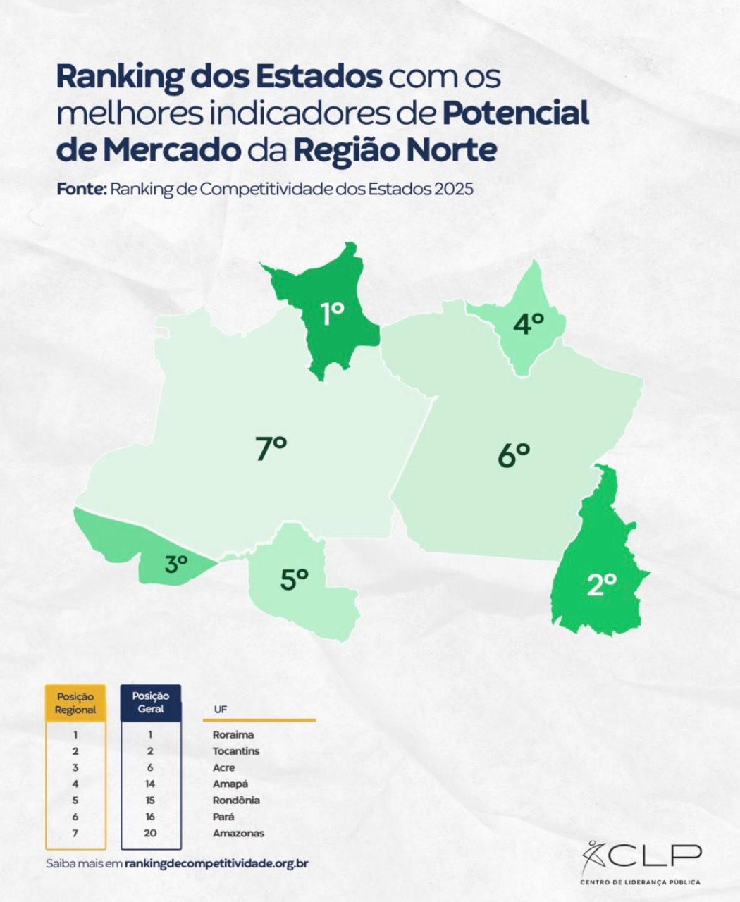Segundo levantamento feito pelo Centro de Liderança Pública (CLP Brasil), entre os estados da Região Norte com os melhores indicadores de potencial de mercado estão: Roraima, Tocantins, Acre, Amapá, Rondônia, Pará e Amazonas. Na classificação nacional, o Estado ficou em 20º lugar, entre as 27 unidades federativas.
