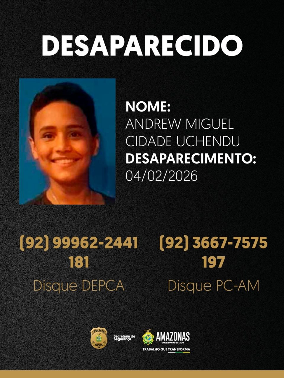 Entre os desaparecidos está Andrew Miguel Cidade Uchendu, de 12 anos, visto pela última vez na quarta-feira (4), por volta das 11h15, na rua Gurupá, bairro Cidade Nova, zona norte da capital.