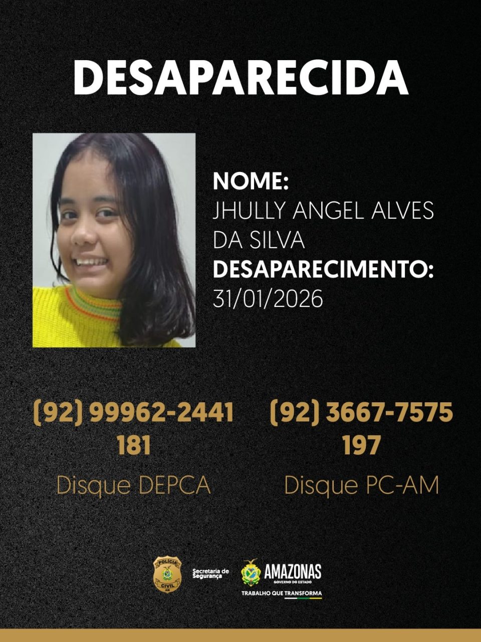 Jhully Angel Alves da Silva, de 15 anos, foi vista pela última vez no dia 31 de janeiro, na avenida Mário Ypiranga Monteiro, bairro Adrianópolis, zona centro-sul.