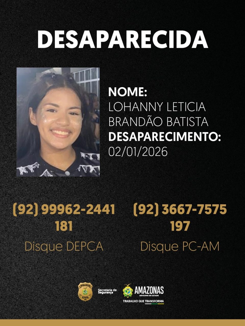 Lohanny Letícia Brandão Batista, de 14 anos, foi vista pela última vez no dia 2 de janeiro, por volta das 11h, na rua Pinhais, bairro Cidade Nova, também na zona norte.