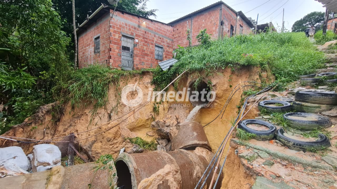 Moradores do Beco Curió, no bairro Gilberto Mestrinho, zona leste de Manaus, enfrentaram transtornos após o desmoronamento de uma tubulação de esgoto durante a chuva registrada na região. O problema causou alagamentos, deslizamento de terra e danos em diversas residências.