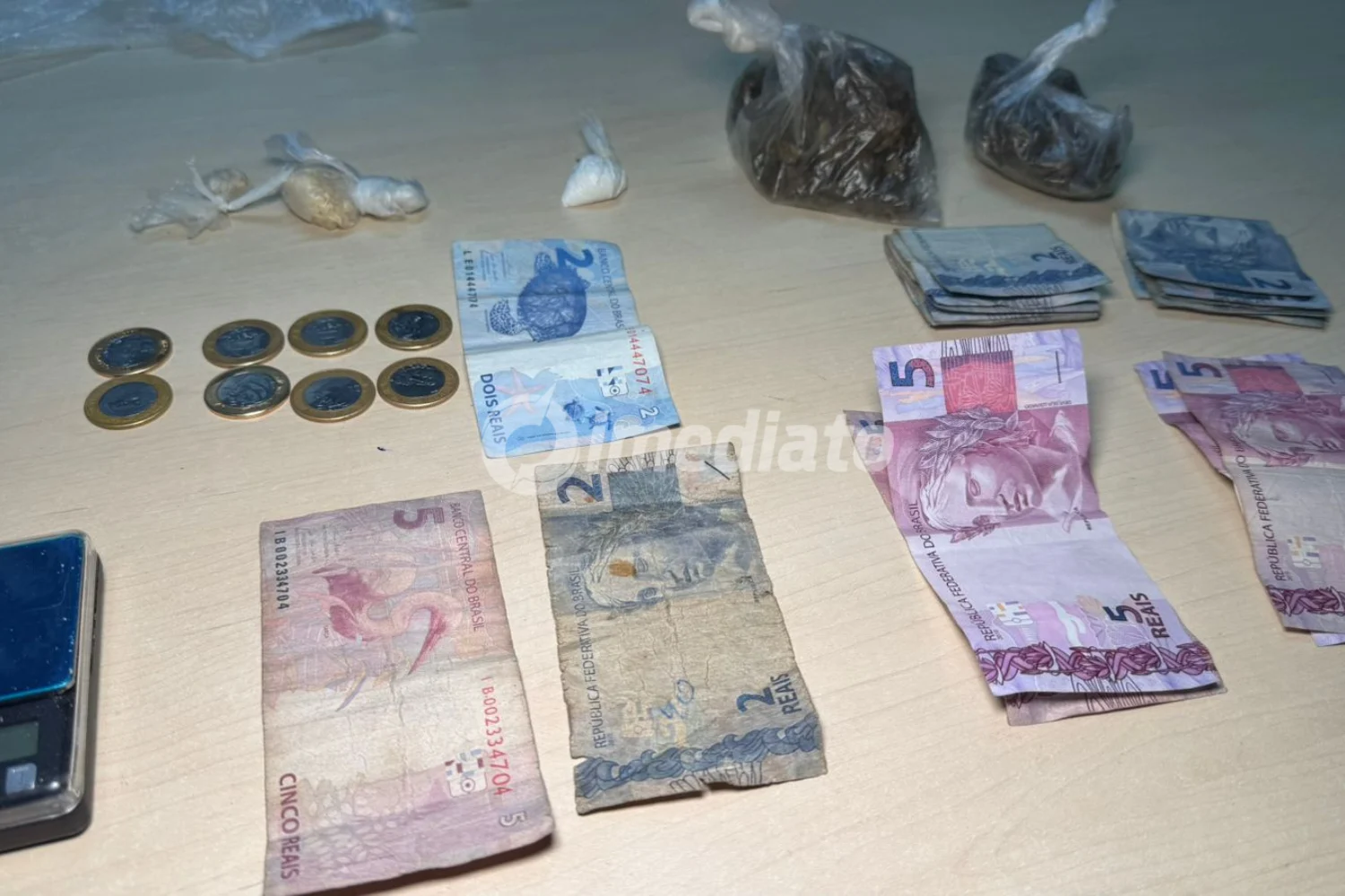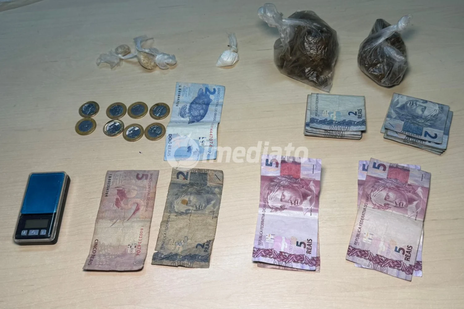 Durante a revista pessoal, os policiais encontraram com o suspeito R$ 57 em espécie, uma balança de precisão, geralmente utilizada para fracionar drogas, e porções de substâncias entorpecentes, entre elas maconha, cocaína e um material com características semelhantes a óxido. Todo o material foi apreendido.