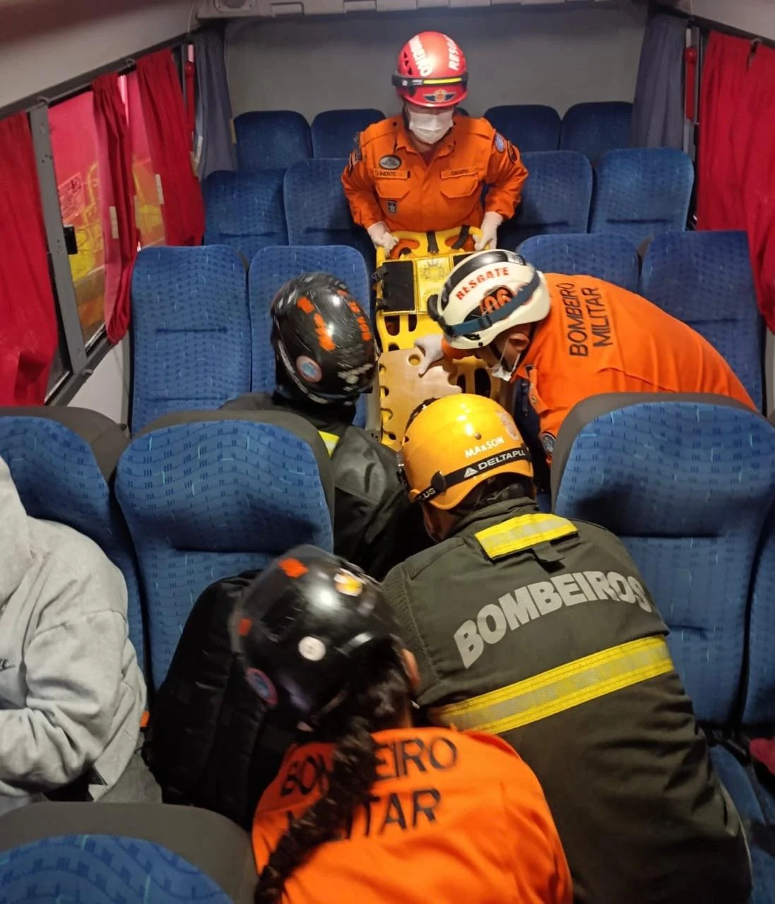 Dez vítimas ficaram retidas dentro do micro-ônibus e precisaram ser resgatadas após o trabalho de desencarceramento realizado pelos militares, que removeram a porta do veículo para retirar os ocupantes com segurança.