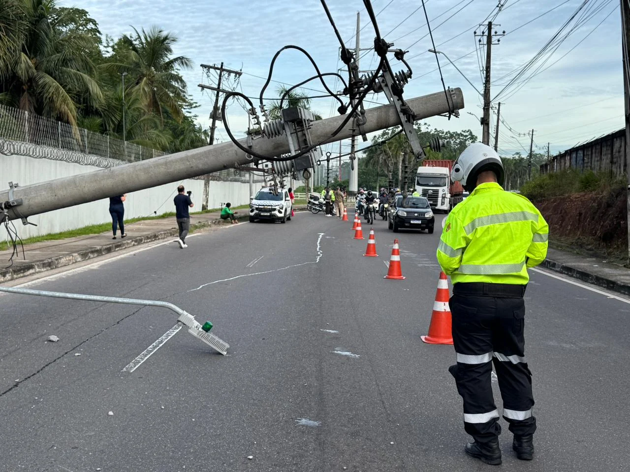 Segundo informações repassadas no local, o acidente aconteceu por volta de 5h ou 5h30 da manhã. Com o impacto da batida, o poste caiu e ficou atravessado no meio da via, bloqueando parte da pista e causando um longo engarrafamento no sentido de quem segue em direção à Bola do Coroado.