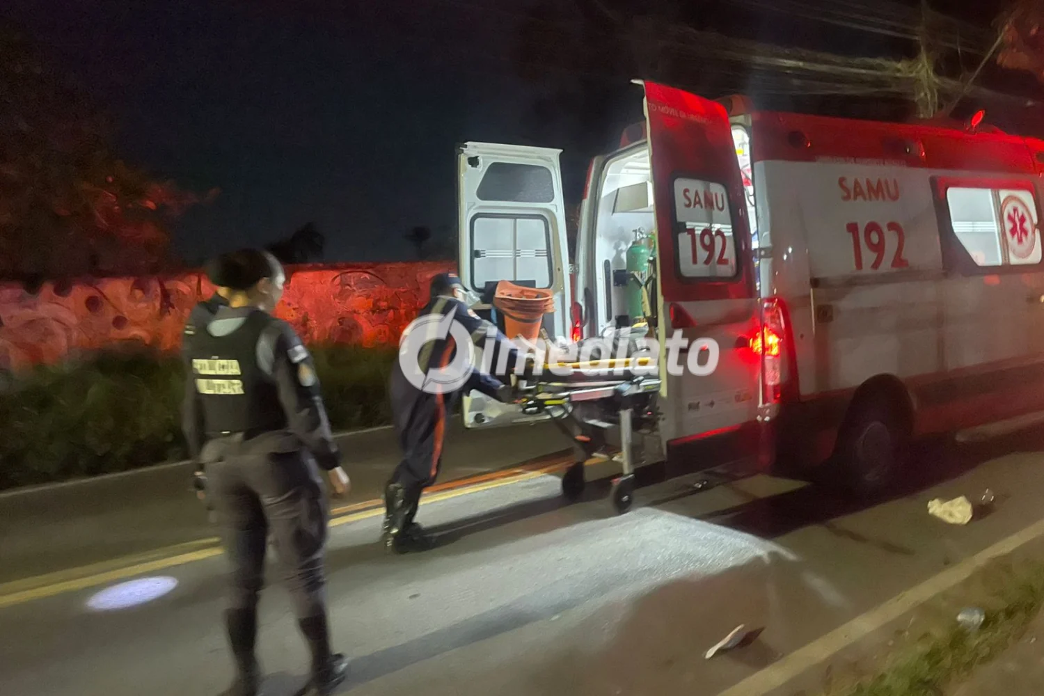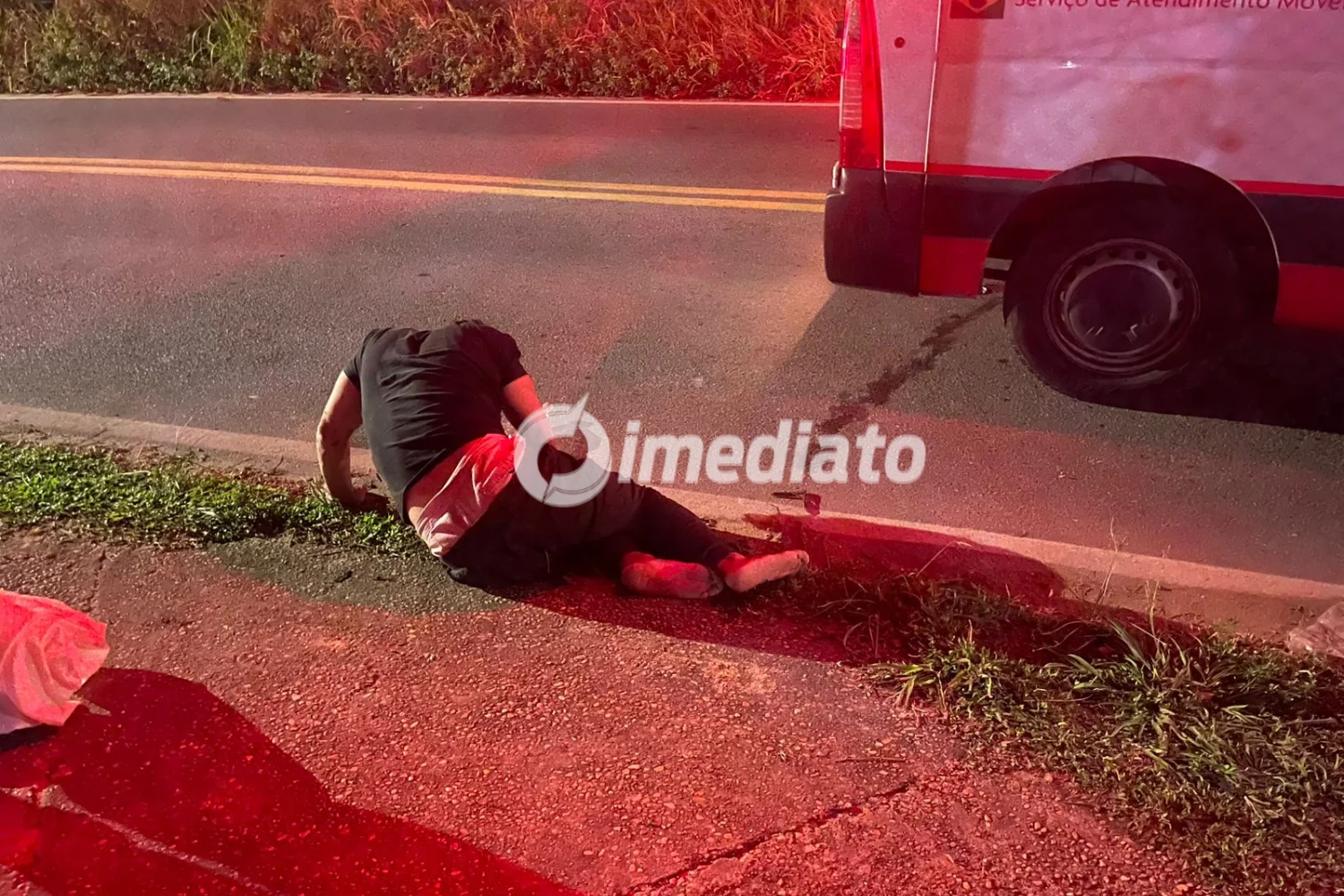O impacto provocou um ferimento considerado significativo, com sangramento intenso. No local, era possível observar marcas de sangue na via, próximas a uma viatura policial, além de objetos espalhados, evidenciando a violência da ocorrência.