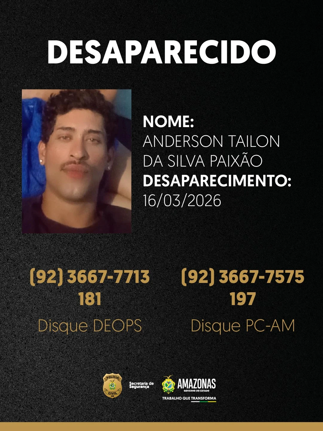 Anderson Tailon da Silva Paixão, de 32 anos, foi visto pela última vez na segunda-feira (16/03), na rua Esmelina Queiroz, bairro Nova Esperança, zona oeste. Quando desapareceu, ele trajava blusa manga cumprida de cor cinza, calça bege, tênis branco e boné preto.
