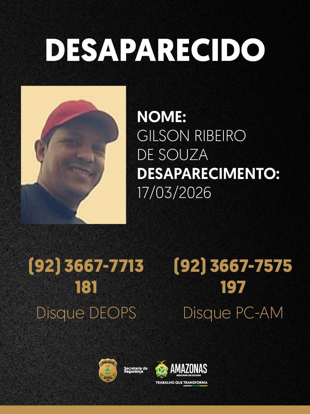 Gilson Ribeiro de Souza, de 48 anos, desapareceu na terça-feira (17/03), na rua Auxiliadora Chaves, bairro Flores, zona centro-sul. Ele usava blusa vermelha, calça moletom preta e sandálias.