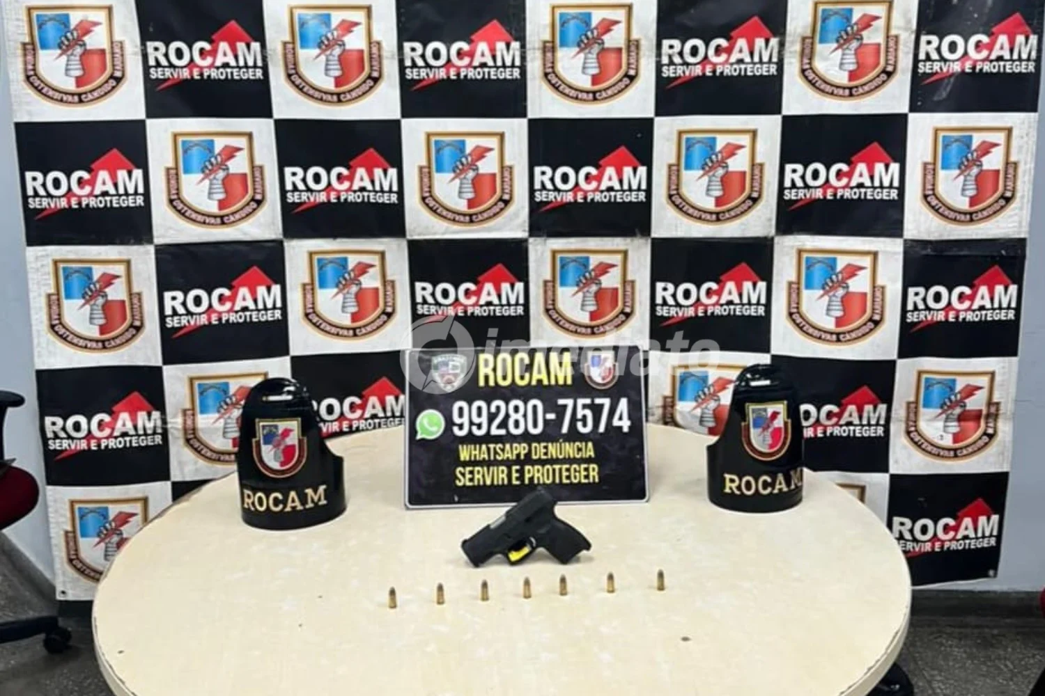 A equipe policial então se dirigiu até o endereço indicado pelo suspeito. No local, foi encontrada uma pistola calibre 9 milímetros, modelo Taurus G3, acompanhada de sete munições intactas e um carregador.