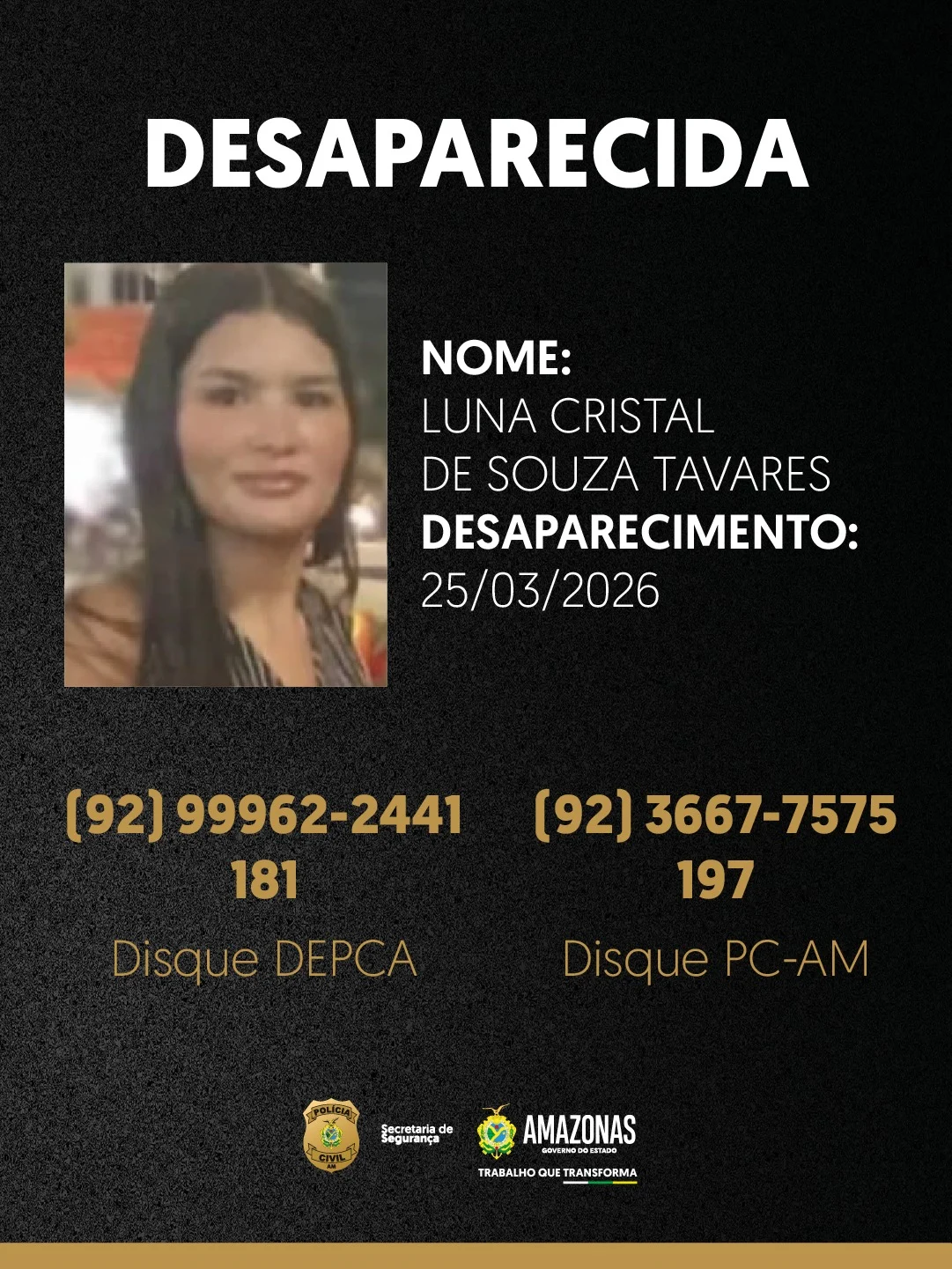 Luna Cristal de Souza Tavares, de 14 anos, está desaparecida desde o dia 25 de março deste ano, após sair da casa onde mora, no município de Santarém, no oeste do Pará, com destino a Rio Preto da Eva (a 57 quilômetros de Manaus), acompanhada de uma tia. No entanto, a mãe da adolescente não teve mais contato com ela.