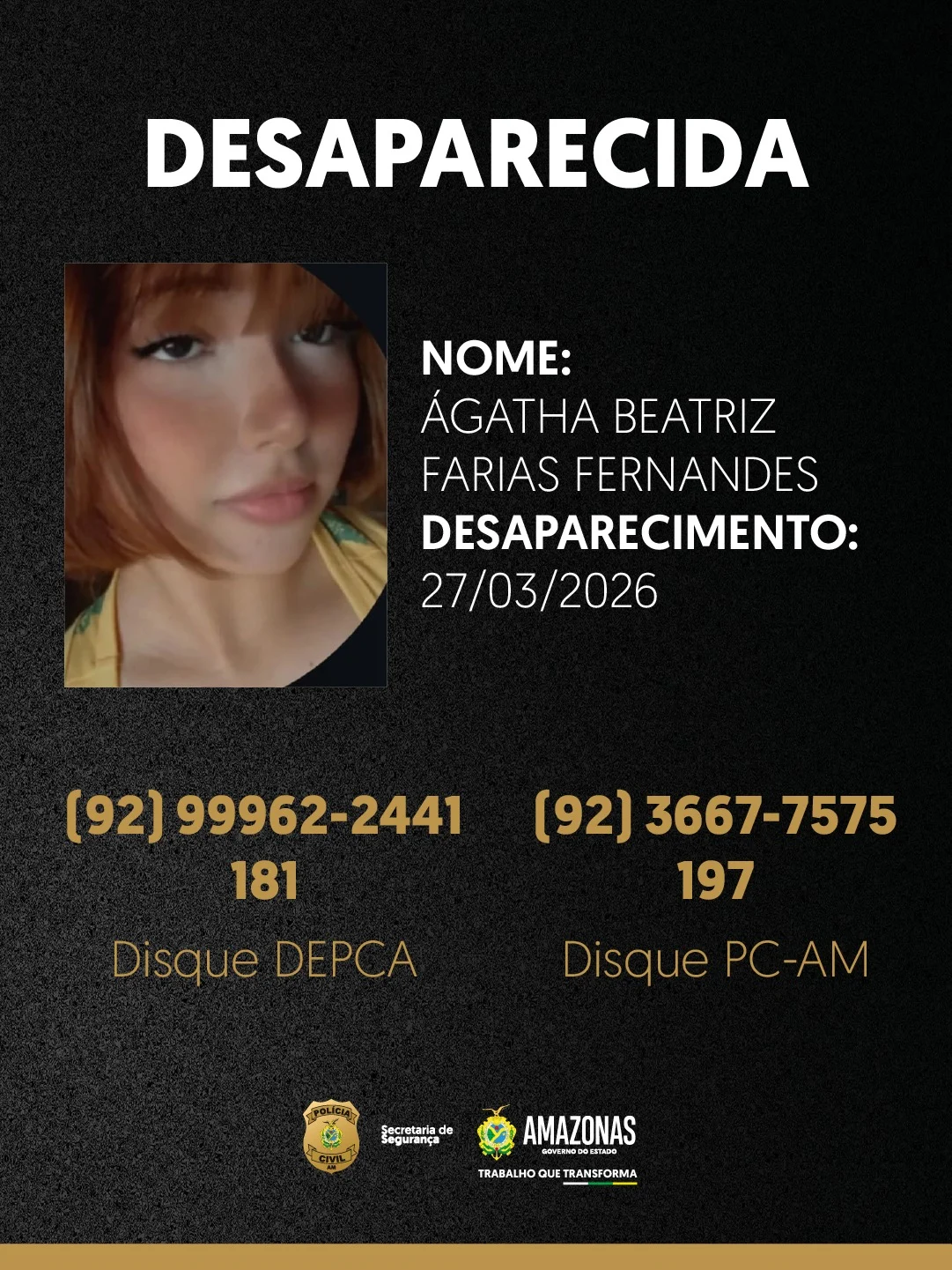 Ágatha Beatriz Farias Fernandes, de 16 anos, desapareceu no dia 27 de março deste ano, por volta do meio-dia, após sair de sua residência, localizada no beco Raio de Luz, bairro São Lázaro, zona sul de Manaus.