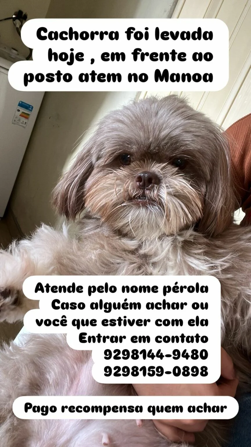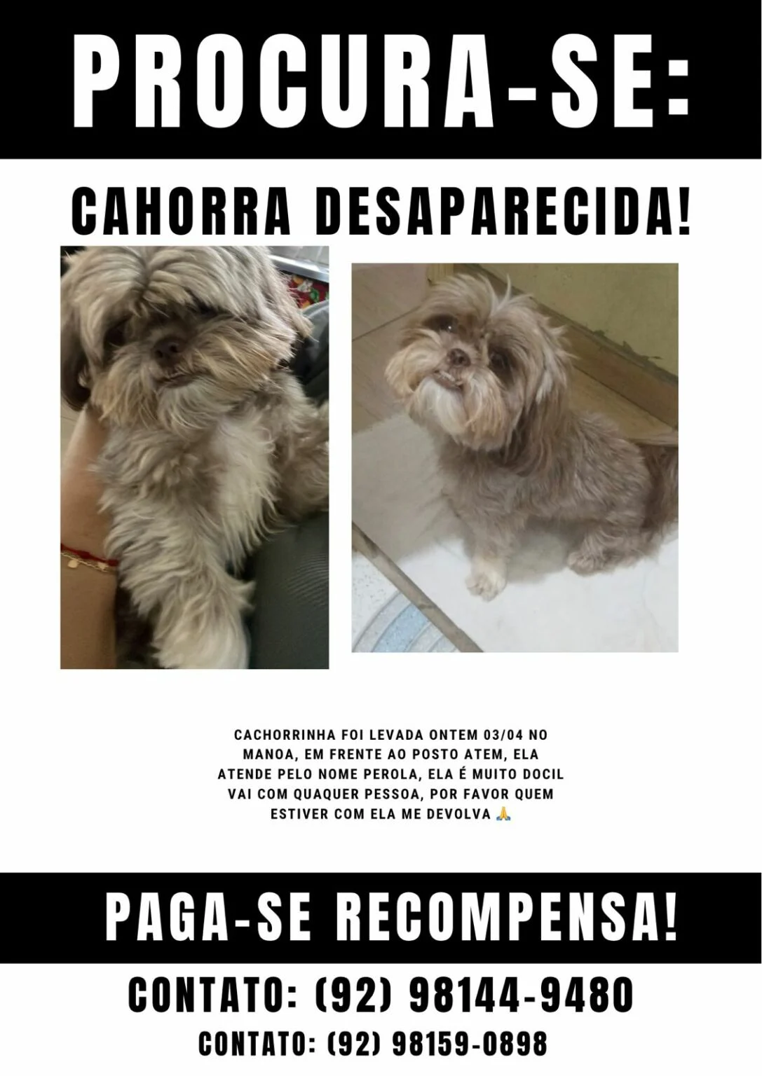 Uma cadelinha da raça Shih-tzu, chamada Pérola, desapareceu na última quinta-feira (3), no conjunto Manoa, bairro Cidade Nova, zona norte de Manaus. Segundo os tutores, ela foi levada em frente ao Posto Atem.
