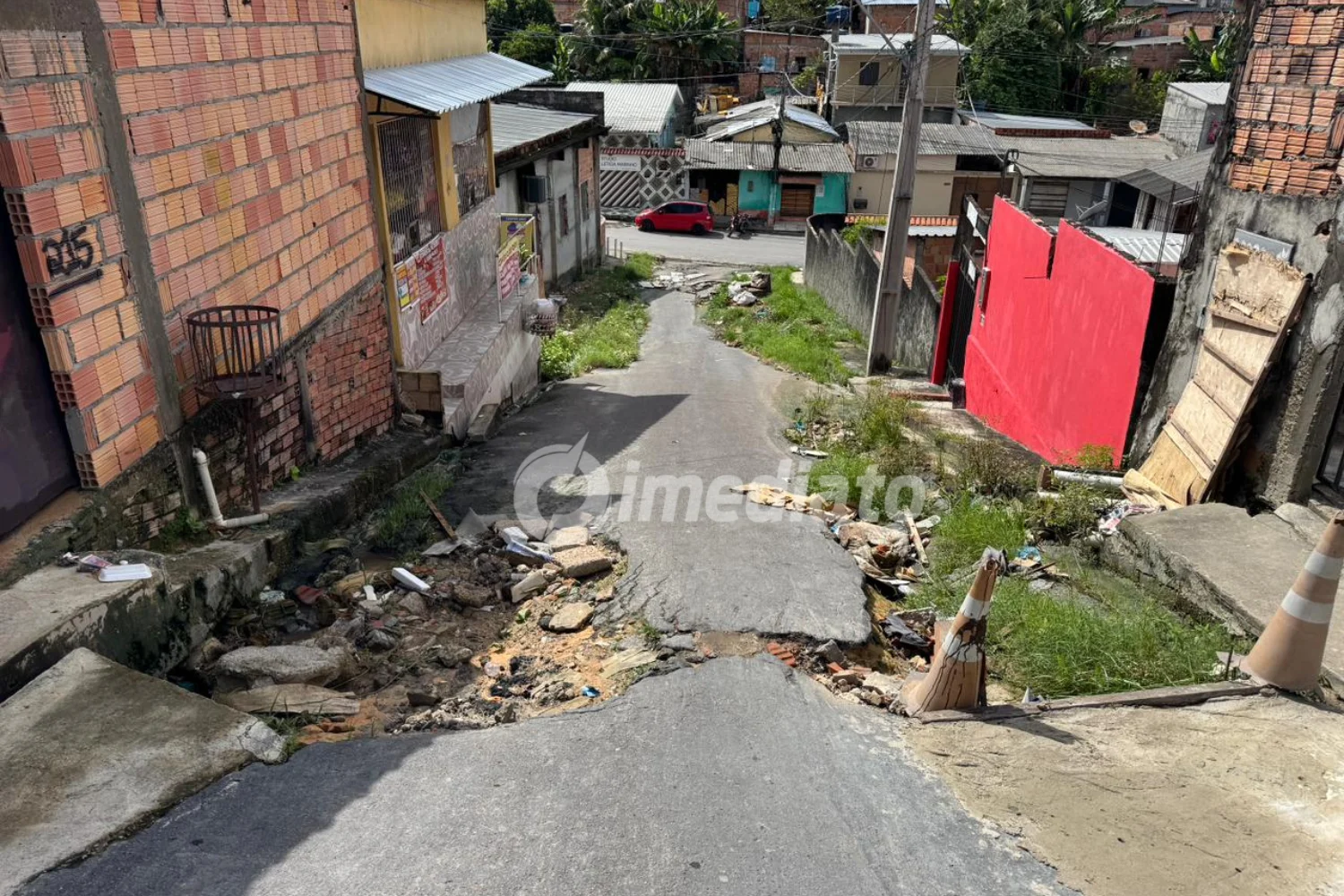 Outro problema apontado é o agravamento da situação durante o período chuvoso. Com as fortes chuvas, a via fica ainda mais comprometida, com acúmulo de água e arraste de lixo, tornando a circulação ainda mais perigosa. Moradores também relataram que uma estrutura de muro na área acabou cedendo após uma chuva intensa, aumentando a preocupação com a segurança de residências próximas.