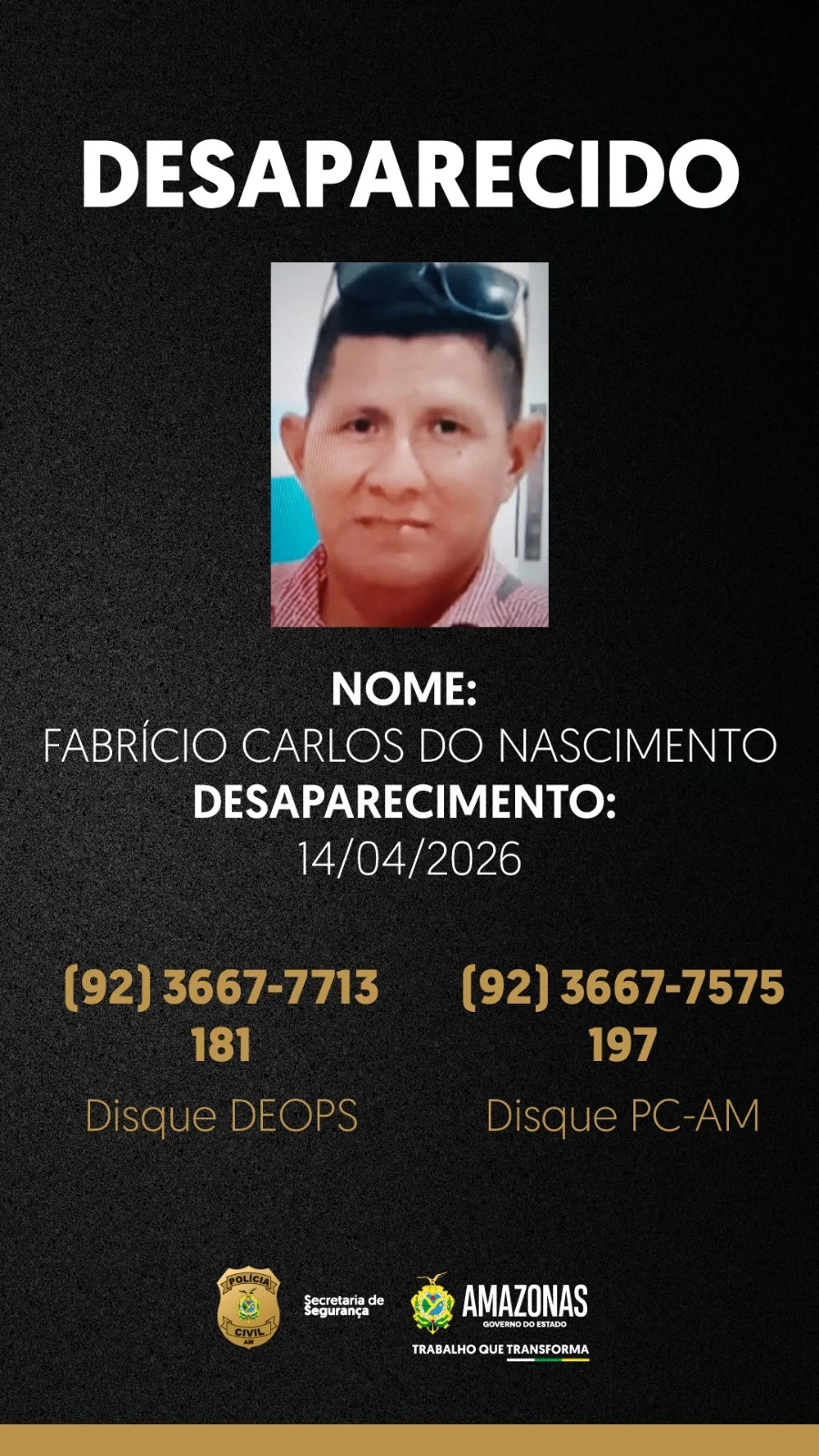 A Polícia Civil do Amazonas (PC-AM), por meio da Delegacia Especializada em Ordem Política e Social (Deops), solicita ampla divulgação das imagens de Fabrício Carlos do Nascimento, 39 anos, e Célio Renato Morais da Silva, 46 anos, que desapareceram em datas e locais distintos em Manaus.