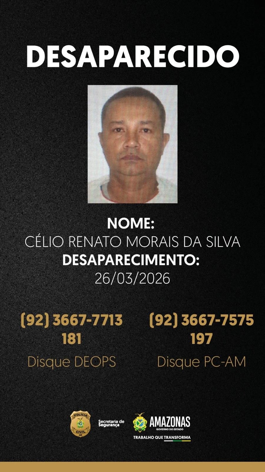 Já Célio Renato Morais da Silva está desaparecido desde o dia 26 de março, após sair de casa no bairro Japiim, zona sul da capital. Essa também foi a última vez em que manteve contato telefônico com a família.