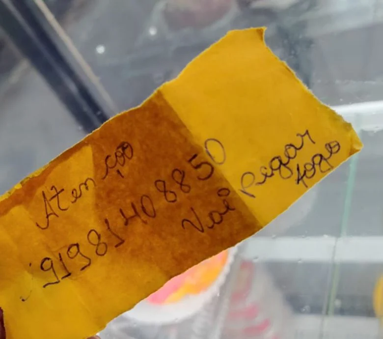 mulher suspeita de tentar extorquir comerciantes no bairro 40 Horas, em Ananindeua, foi localizada após uma denúncia. Ela ficou conhecida depois de ser flagrada por câmeras de segurança deixando um bilhete em um estabelecimento, onde exigia o pagamento de uma suposta “taxa do crime” e ainda fornecia um número de telefone para contato.