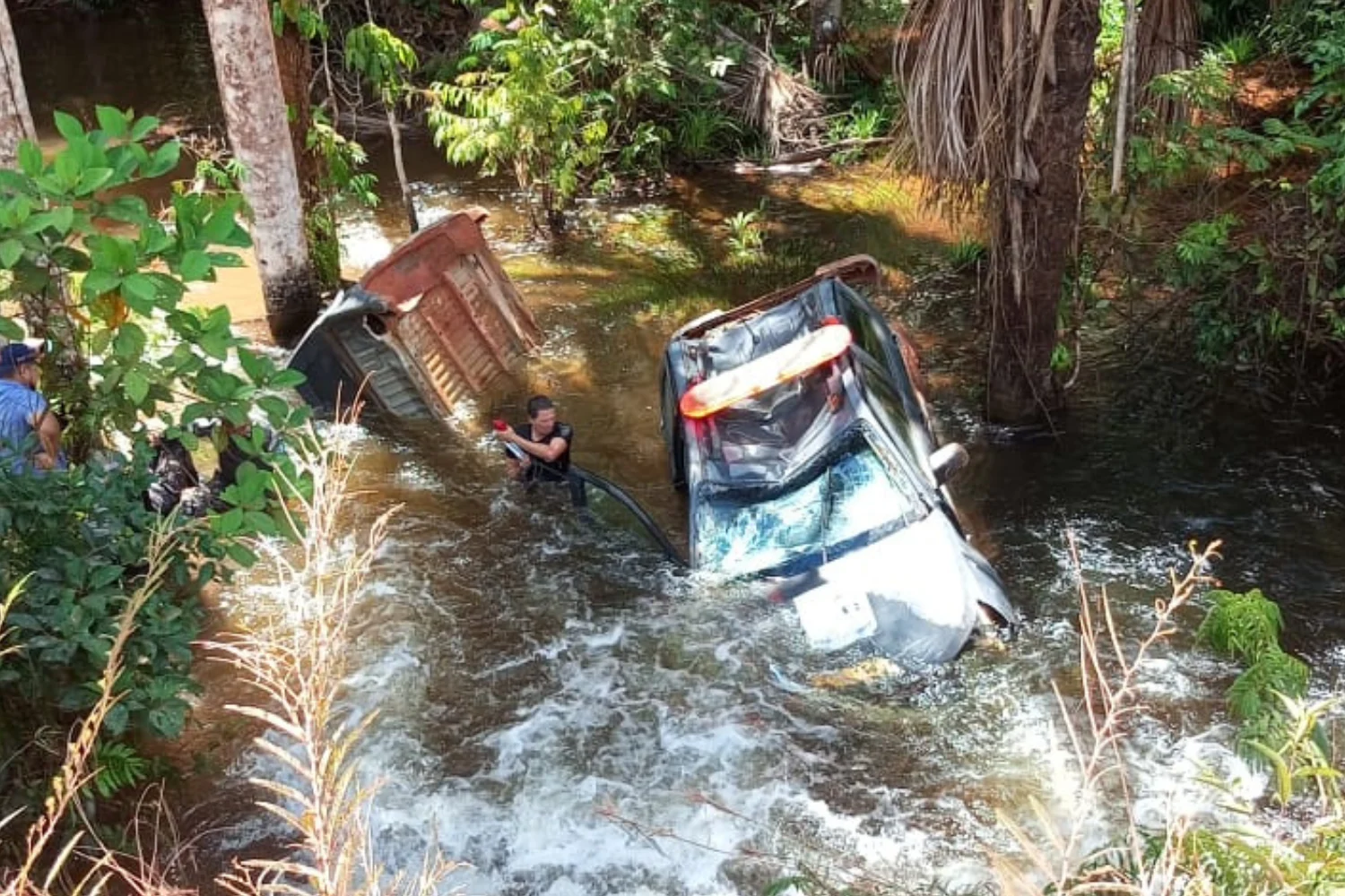 As equipes seguiam em missão de apoio a ações ambientais na região quando, em determinado ponto do trajeto, uma das viaturas perdeu o controle da direção. O veículo saiu da pista, caiu em uma área de declive e acabou imerso em um igarapé.