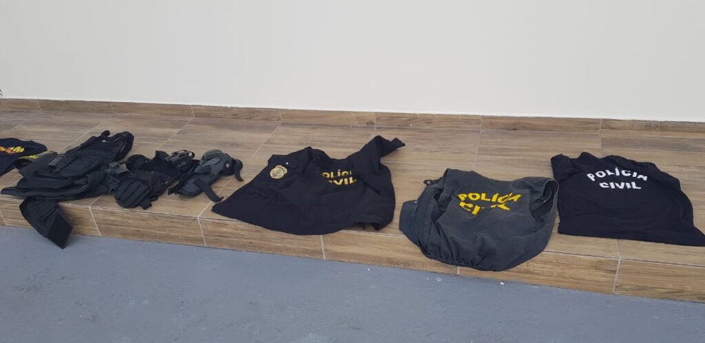 Uma vítima, que seria um empresário, foi resgatada. Cinco homens foram presos, inclusive dois policiais militares. Eles são acusados de extorsão e sequestro. Foram apreendidos dois veículos, uniformes com a inscrição da Polícia Civil, balaclava e chip de celular. A ação policial aconteceu após denúncia.